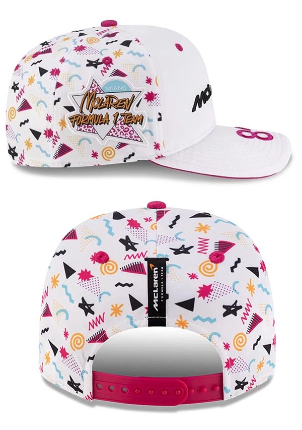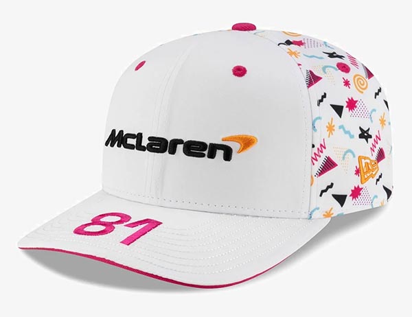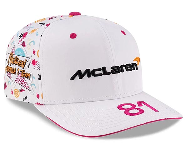 Бейсболка McLaren Miami Piastri реплика, с вышитым логотипом команды и вышитым стартовым номером Оскара Пиастри на козырьке.